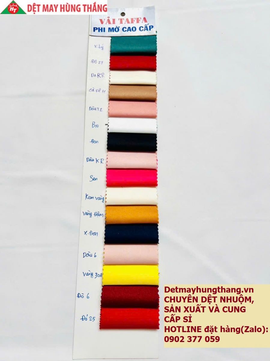 Dệt Nhuộm May Hùng Thắng chuyên dệt nhuộm, sản xuất và cung cấp số lượng lớn nhiều loại vải cho khách sỉ với giá tốt: Vải tuyết mưa, Vải cotton lạnh, Vải đũi lụa, Vải lót lụa, Vải may cờ, Vải may áo phao, Vải may diều, Vải chiffon, Vải phi thun, Vải Satin, Vải Tuyết Gold, Vải Gấm, Vải Phi mờ cao cấp (hay còn gọi là vải Taffeta), Vải For, Vải Linen gân...